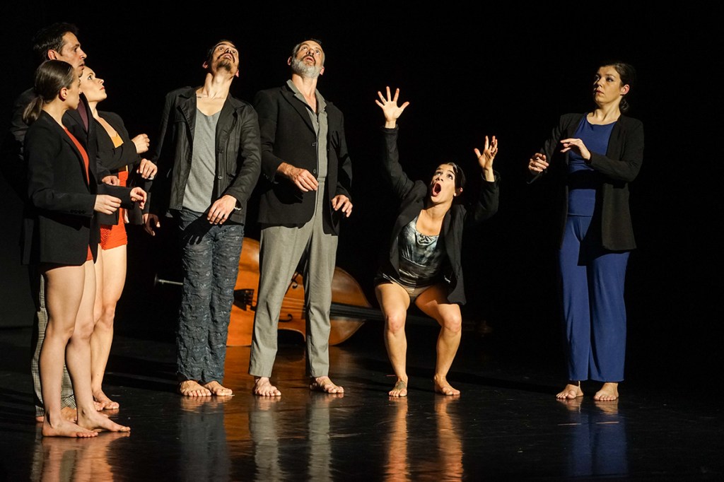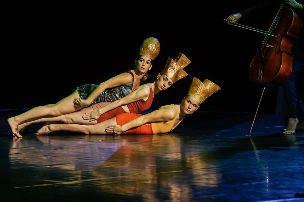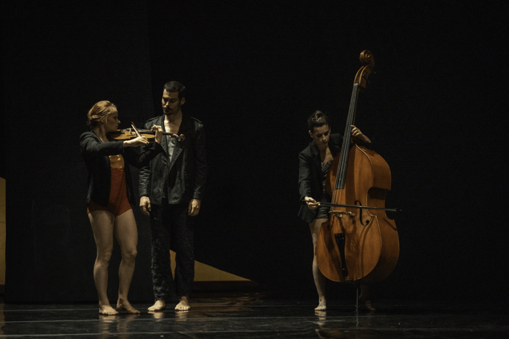 The particular musical sound is created by a small family of plucked string instruments – a violin, a cello, and a double bass – which unfold into exploratory multiplicities, beyond their musical function – what they are as objects, what relationships they enable with the performers, with the stage space, and with the direction. At times, an electronic musical discourse is added to this acoustic environment, suggesting another, parallel place, and revealing itself only in specific moments.